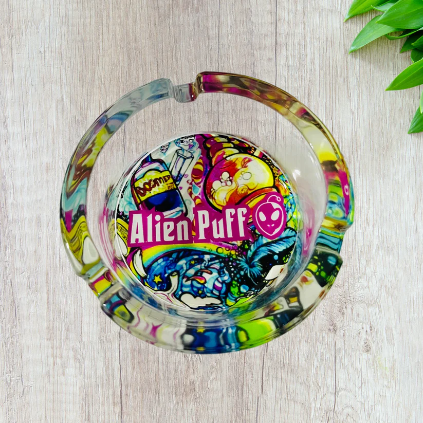 Ignite your smoking space with cosmic energy using the Alien Puff Psychedelic Glass Ashtray — a mesmerizing, round glass masterpiece bursting with vibrant, swirling colors and intergalactic flair. This eye-catching accessory features an ultra-vivid, iridescent rainbow finish that shifts and flows in hypnotic patterns of pink, blue, green, yellow, purple, and more, creating a true psychedelic vibe that turns heads and sparks conversations. At the center, the iconic Alien Puff logo stands bold in hot pink, surrounded by playful, cartoonish alien characters, bubbling bongs, “BOOMPD” graphics, tropical leaves, stars, and whimsical smoke clouds — it’s pure fun fused with extraterrestrial attitude.