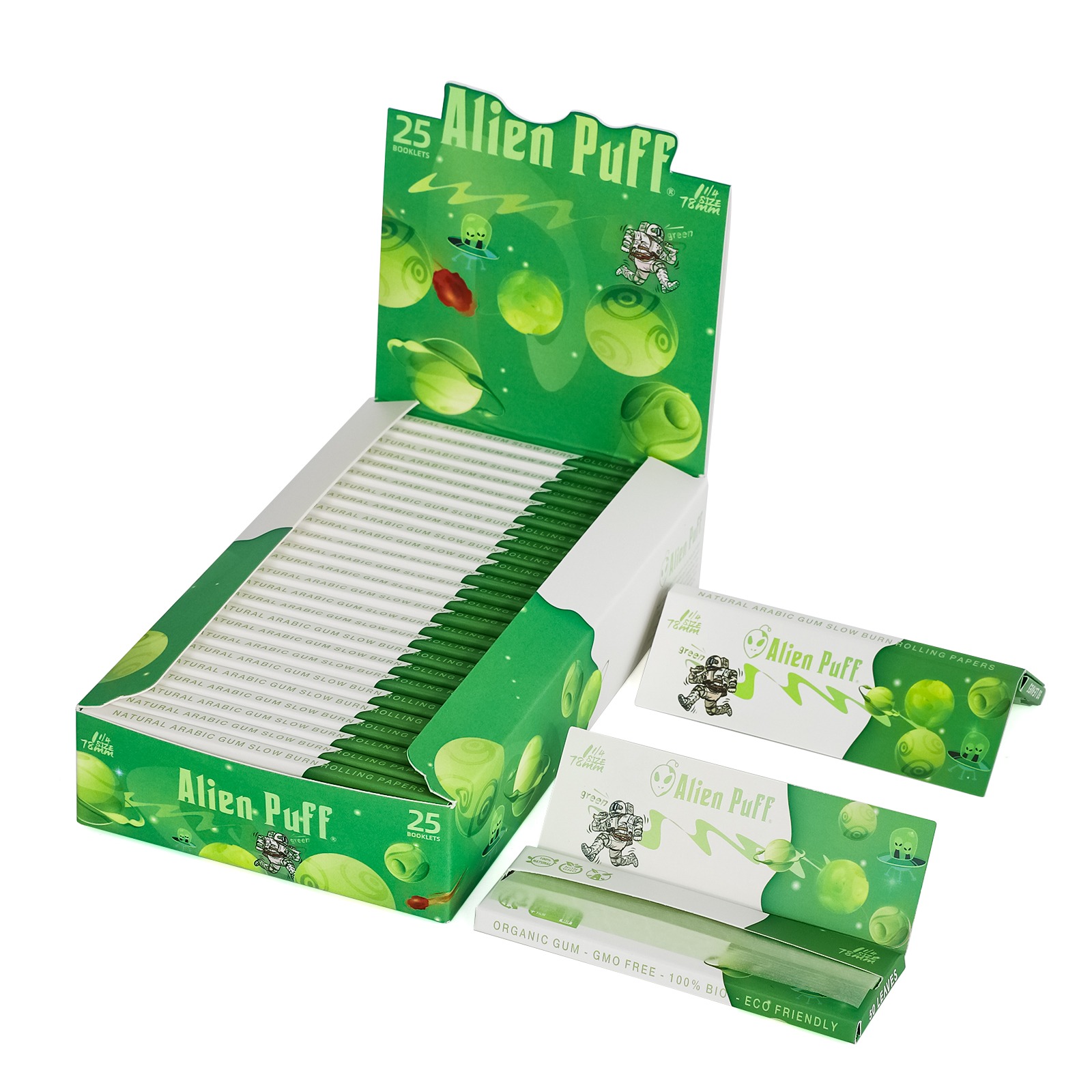 Alien Puff Green Rolling Papers – 1 1/4 Size (25 Booklets-50 Leaves) 👽 Elevate your sessions to cosmic levels with these extraterrestrial rolling papers that fuse eye-catching vibes and top-tier quality for an unbelievably smooth, otherworldly smoke – while staying gentle on Mother Earth. 🌿🚀