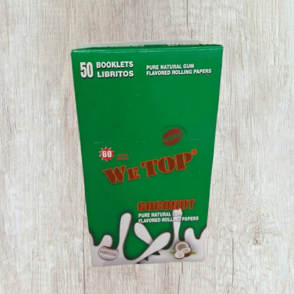 WeTop Flavoured Rolling Papers 1¼ Size – Box (50 Booklets) Coconut bring a creamy, tropical twist to your rolling experience. Infused with the subtle sweetness of natural coconut flavor, each booklet contains 60 ultra-thin leaves designed for a smooth, flavorful burn. Crafted with pure natural gum, these papers seal cleanly and burn evenly—without synthetic additives.